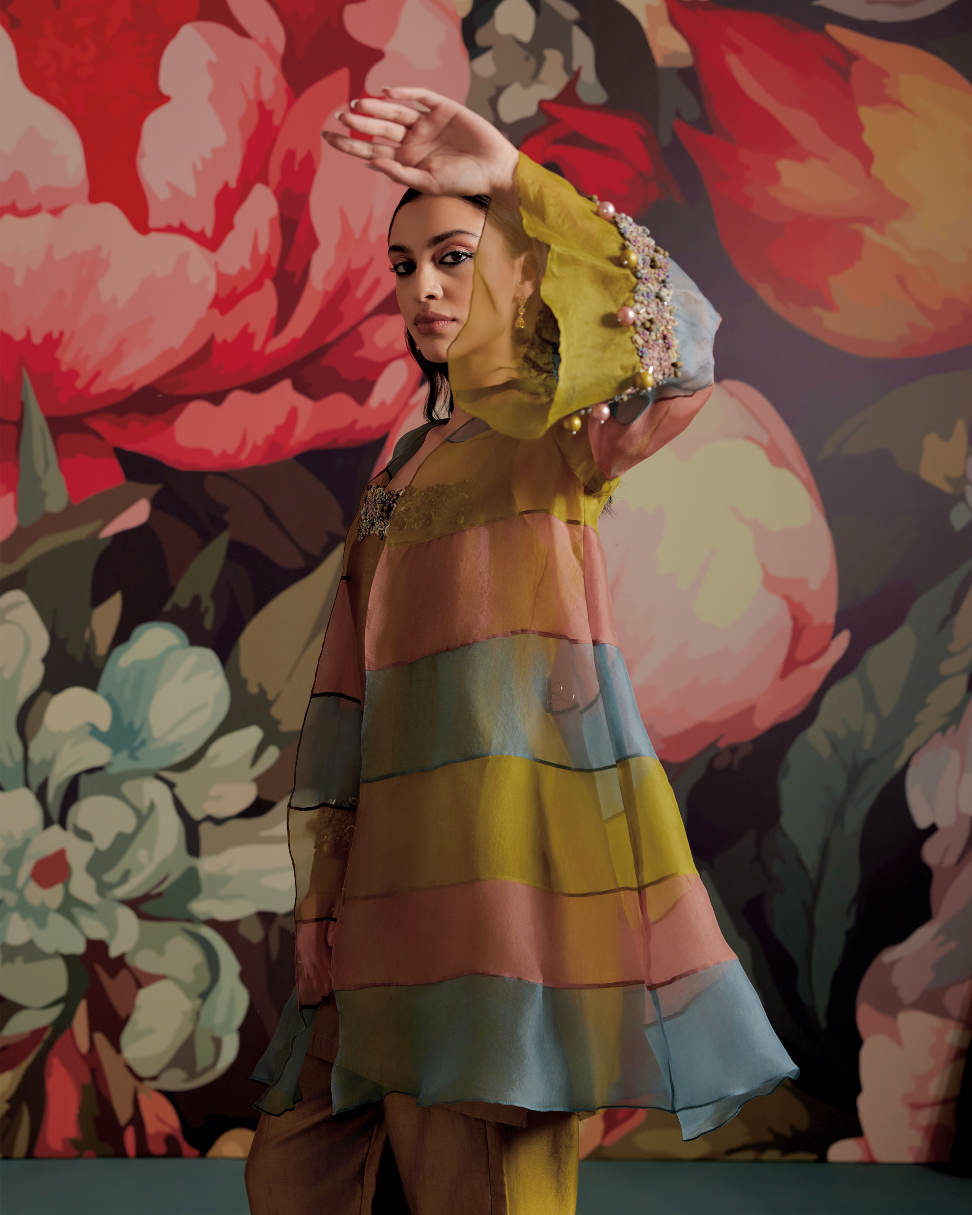 The Angoori Tri-Color Kurta Jacket Set tells a story of elegance and bold color. With its ocado, dusty rose, and teal hues, this pure silk organza jacket pairs with a Chanderi kurta and pants. Rose thread work and Zardozi embroidery add intricate charm, making it perfect for weddings or festive occasions. Style it with statement earrings for a modern yet timeless look.