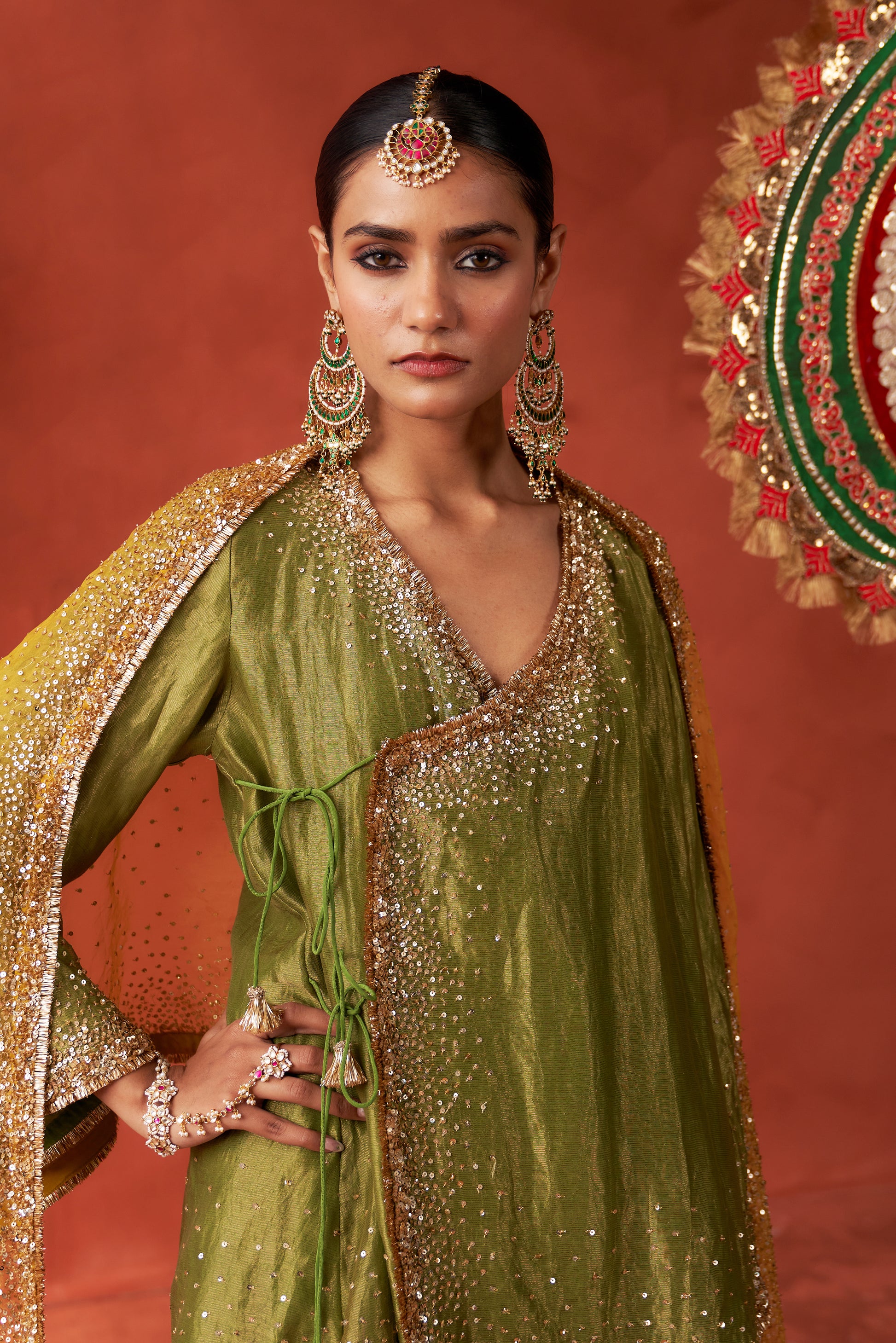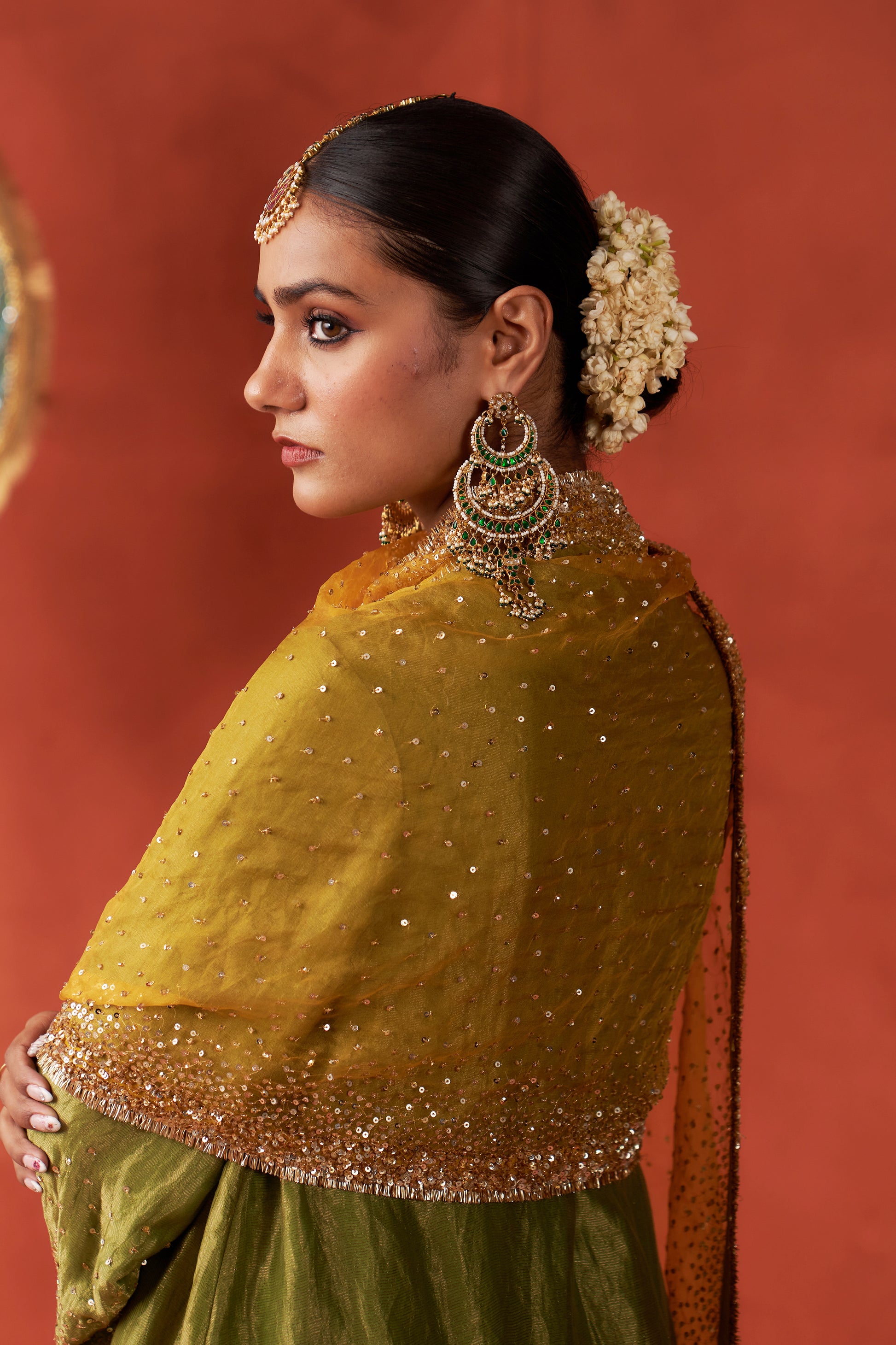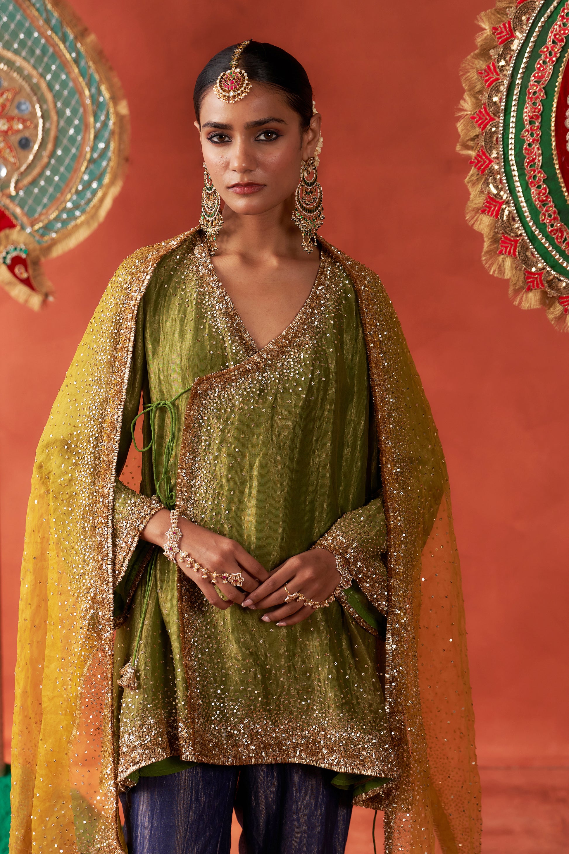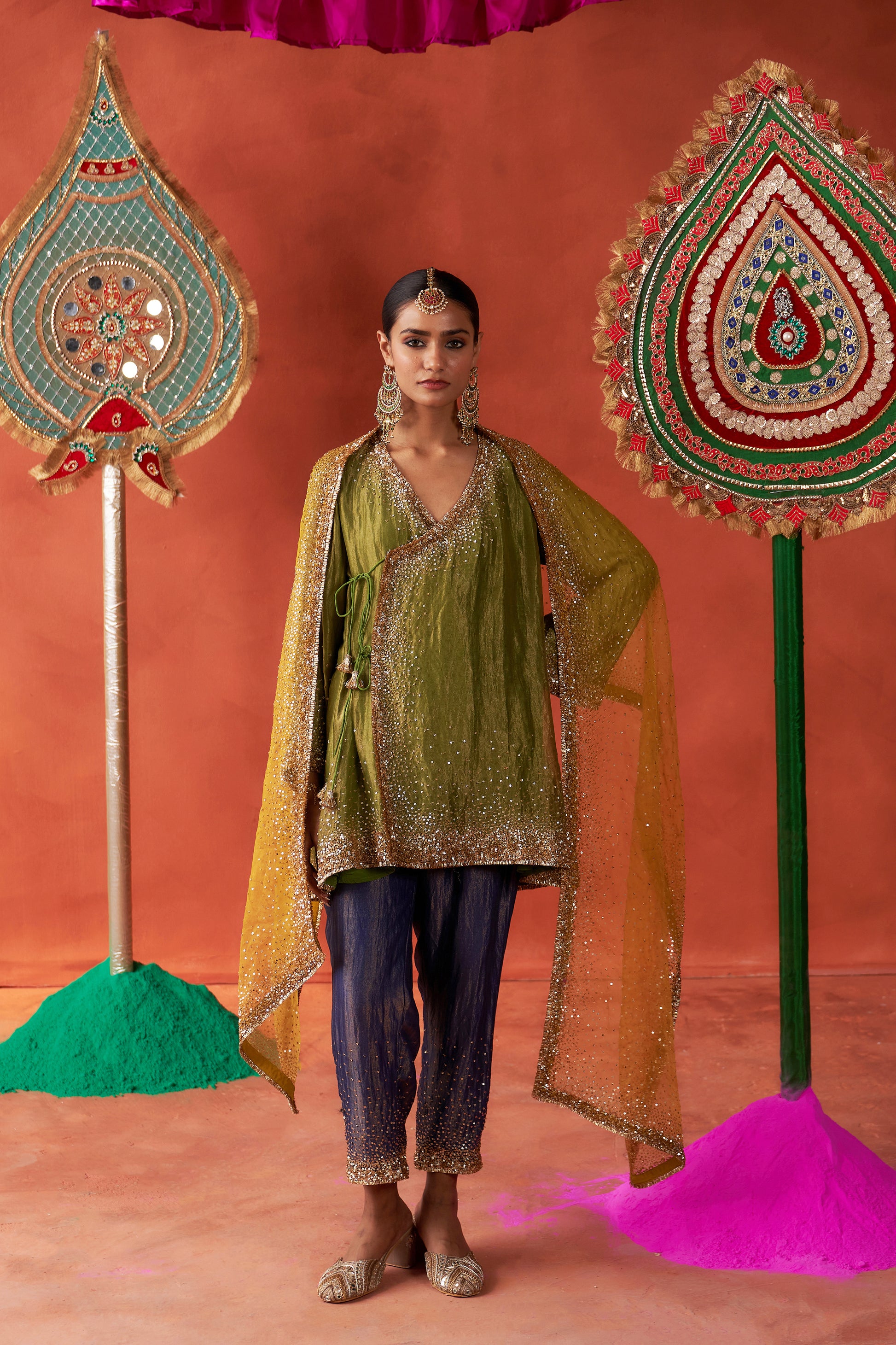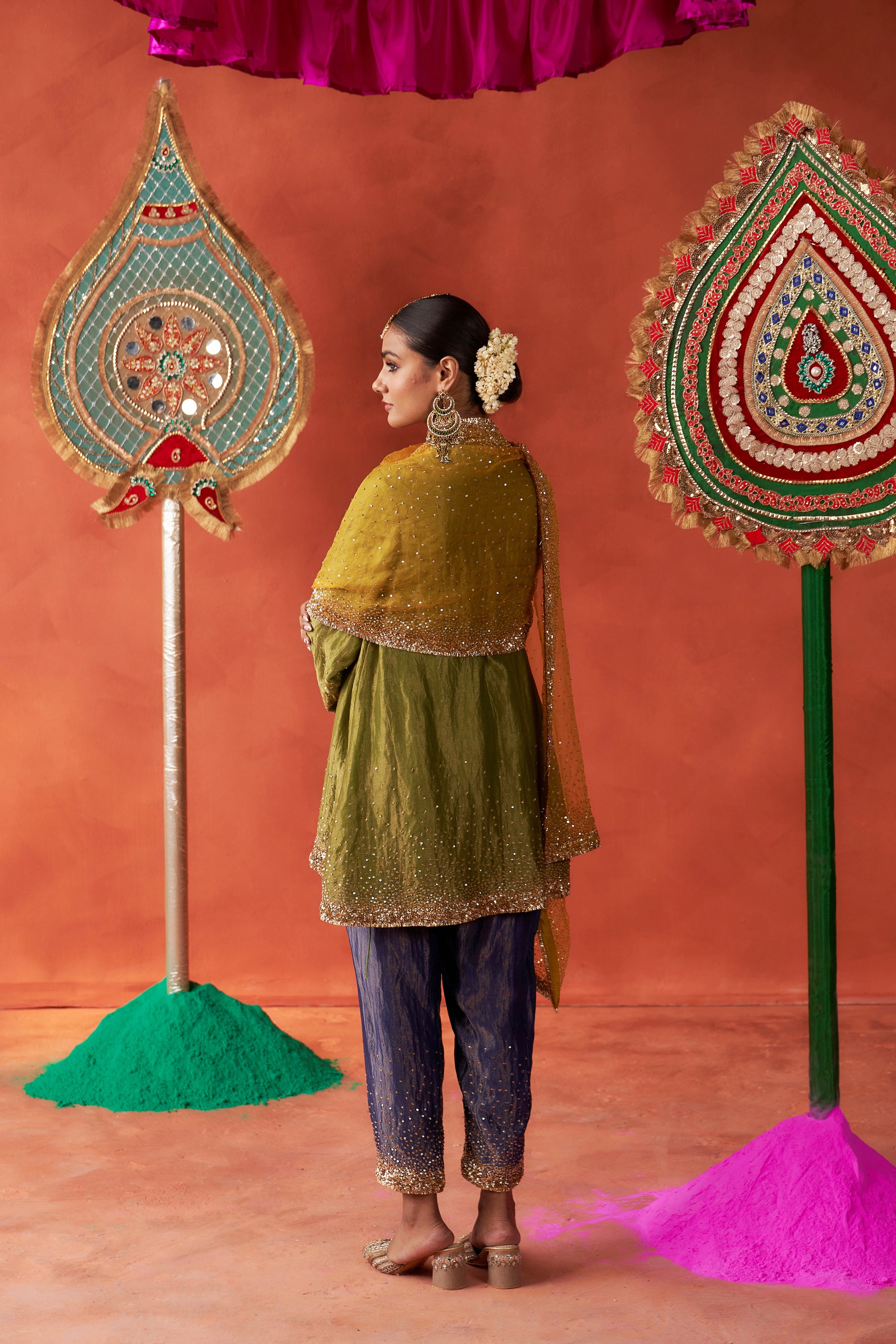 - Color: Mehendi Color Kurta, Eletric Blue Pants, Yellow Dupatta