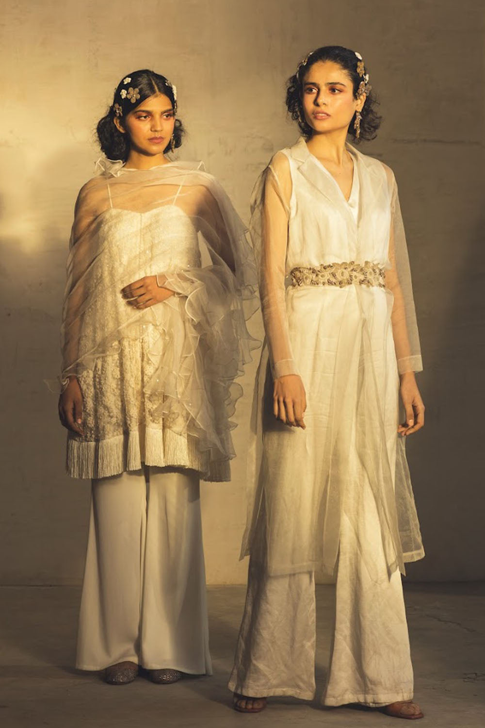 White tone on tone heavily embroidered short anarkali with palazzo pants and pleated dupatta