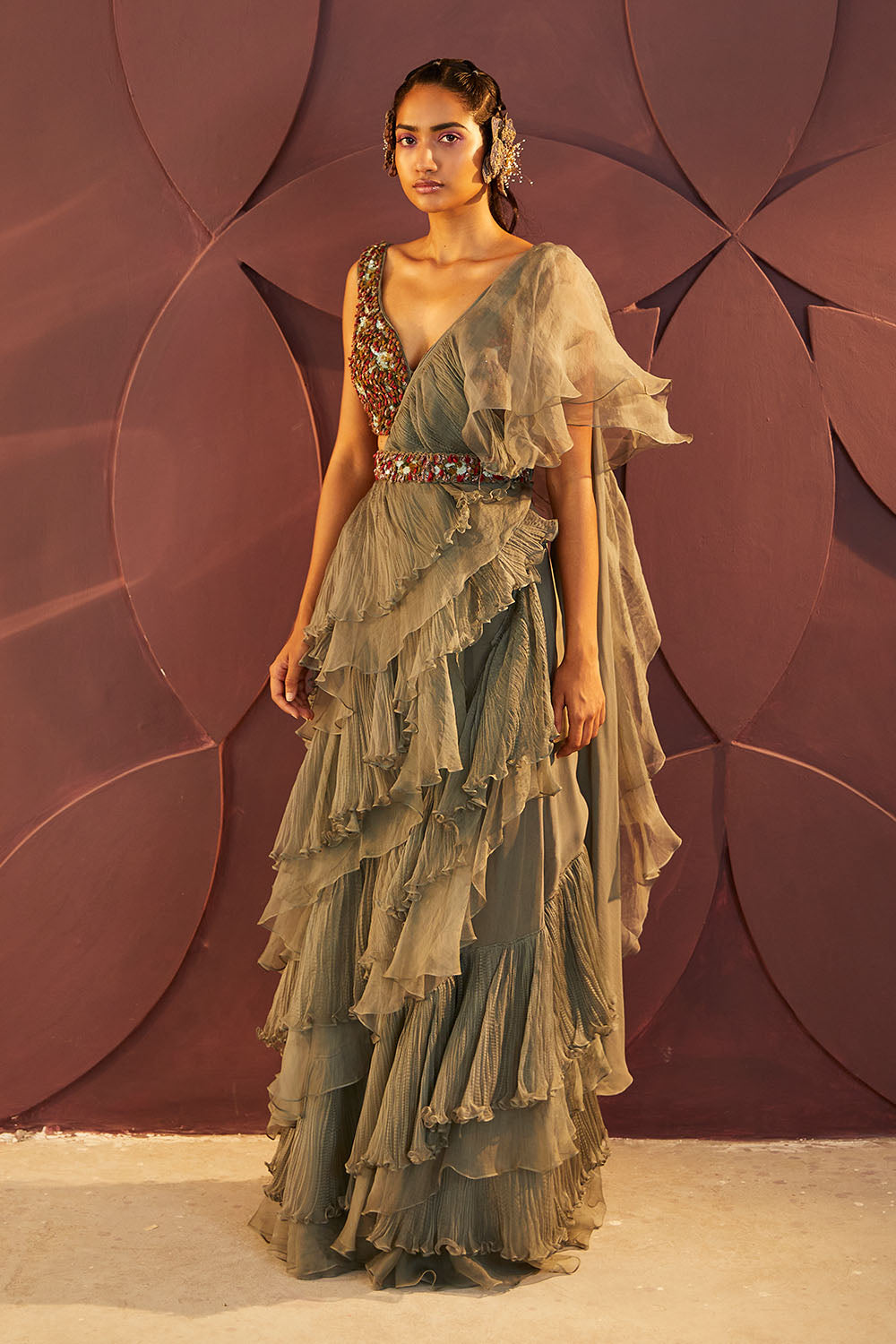 Sage Vivant Ruffled Sari with embroidered highlighted blouse, belt with work of dabka, cutdana and sequence organza ,georgette ruffled saree.