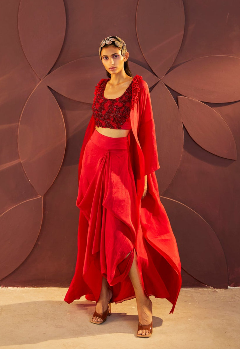 Rose Rogue Cape set with Drape skirt an organza roses on the neck of the cape with an hand embroidered highlighted blouse with dabka, dori and thread work paired with a silk dhoti.