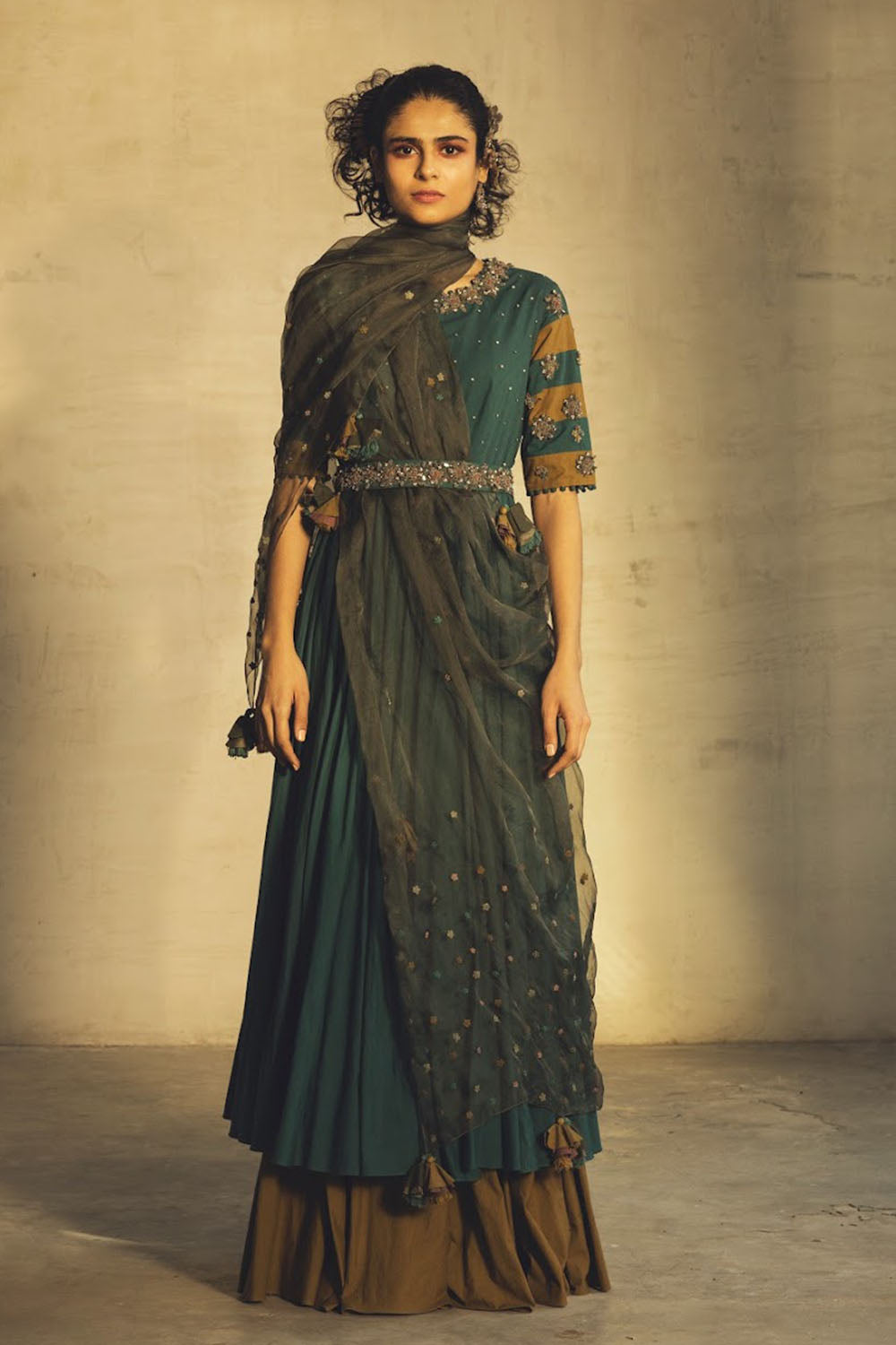 Teal and olive layered embroidered anarkali with olive organza embroidered dupatta and embroidered belt