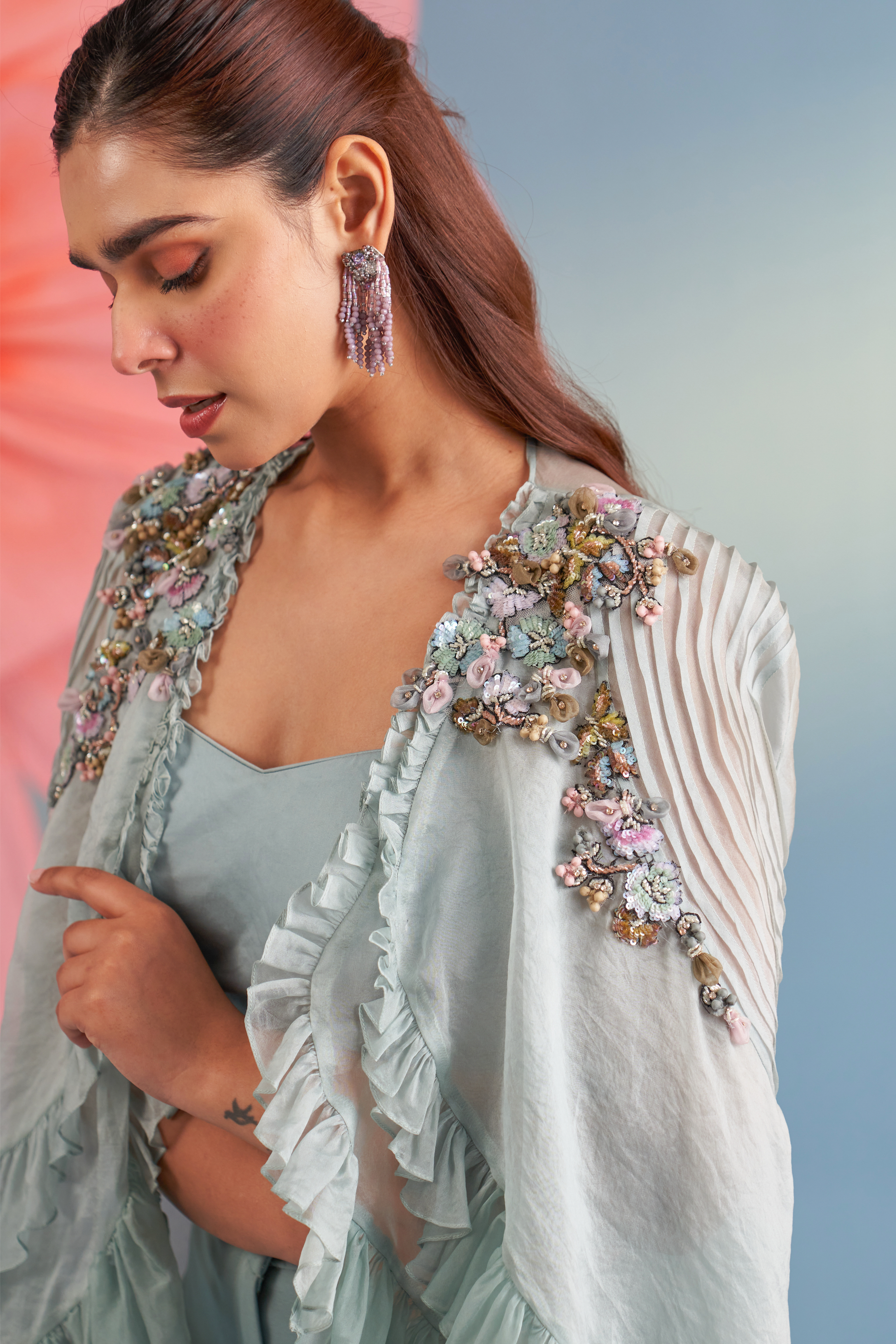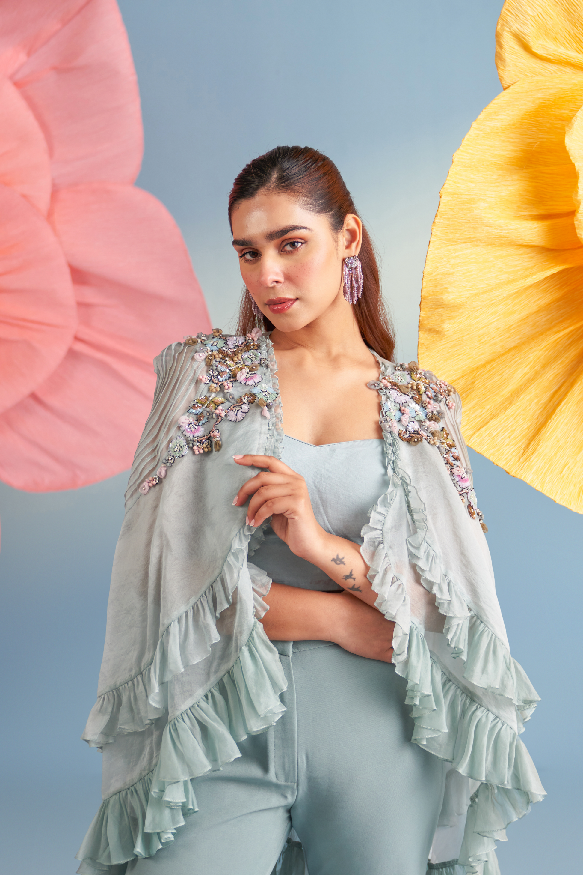 In a serene powder blue, the Emma Coord Set is a graceful three-piece ensemble featuring a flared cape, tailored pants, and a sleek inner. Crafted from pure silk organza and imported crepe, the cape is detailed with soft flare accents at the hem, adding movement and lightness. Embellished with sequins and hand-crafted 3D roses, it brings together subtle drama and refined femininity Ñ making it ideal for intimate celebrations and statement occasions.