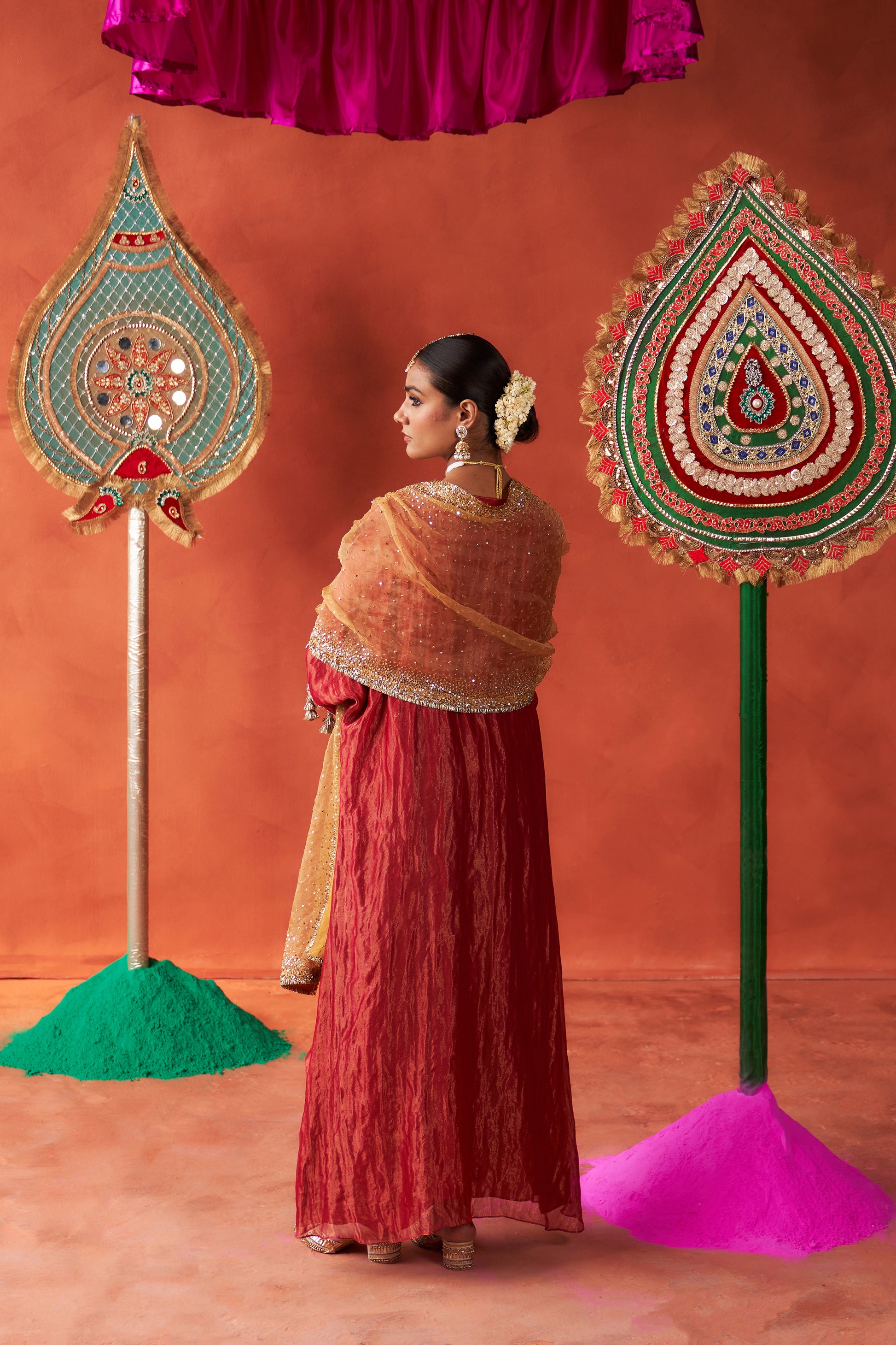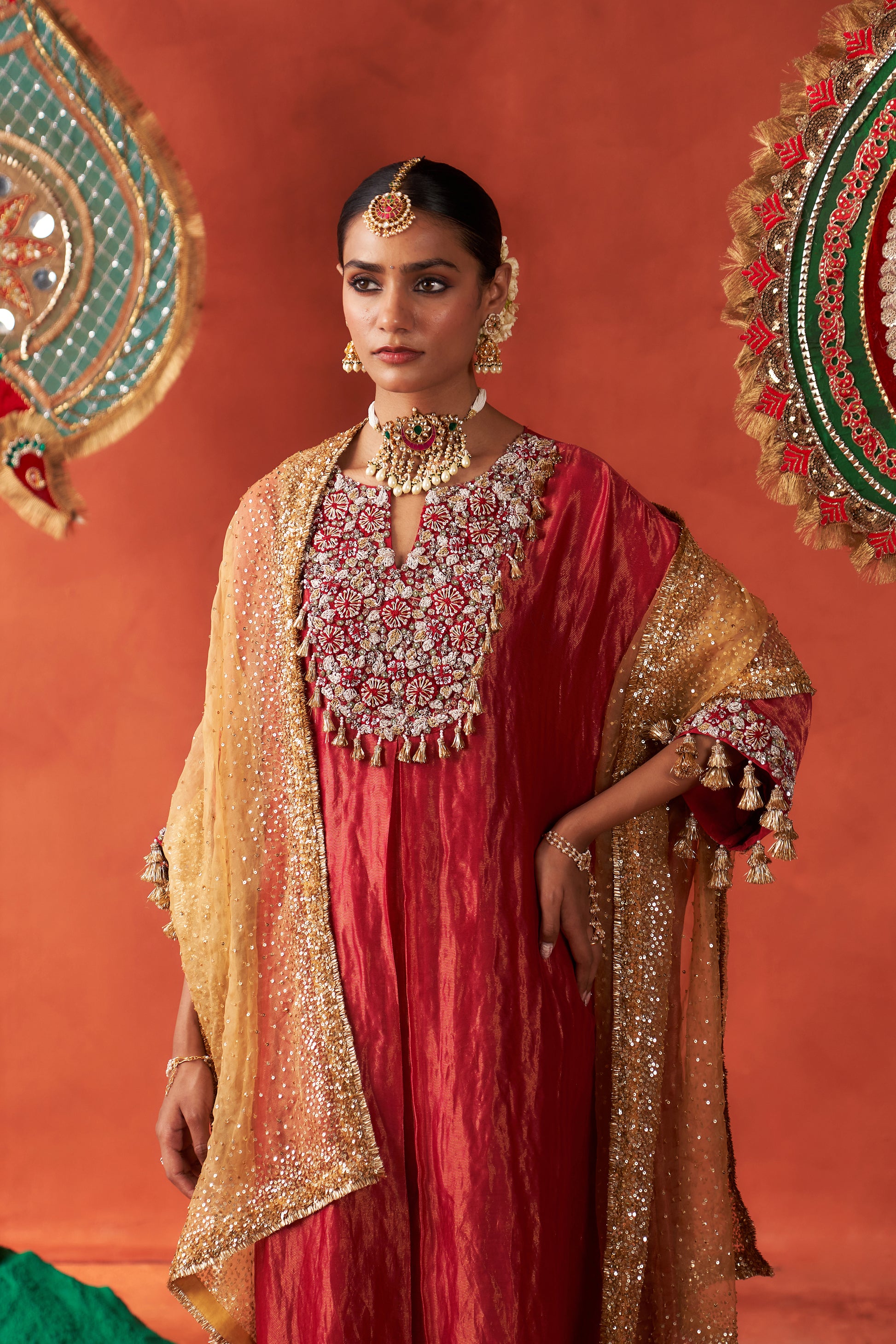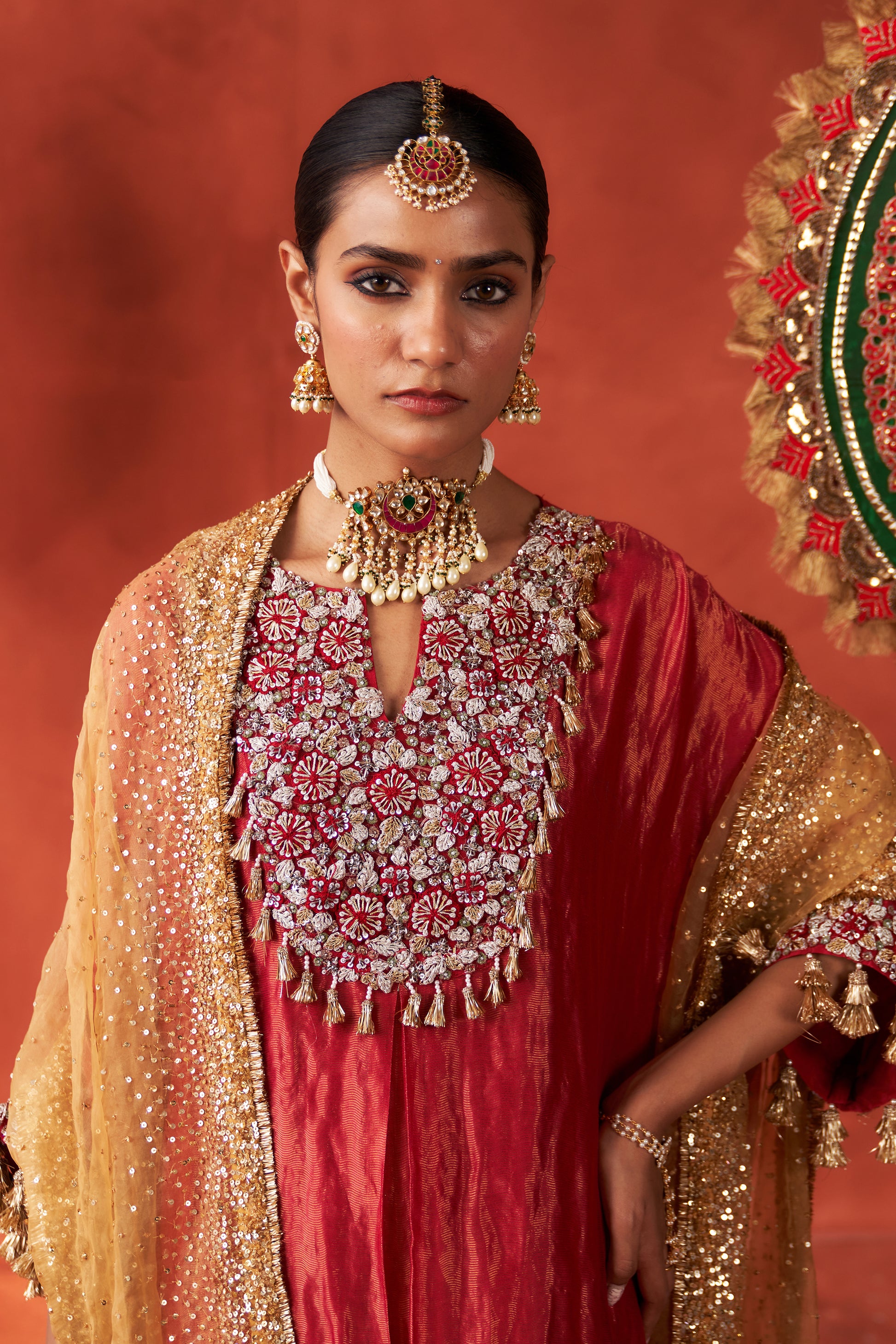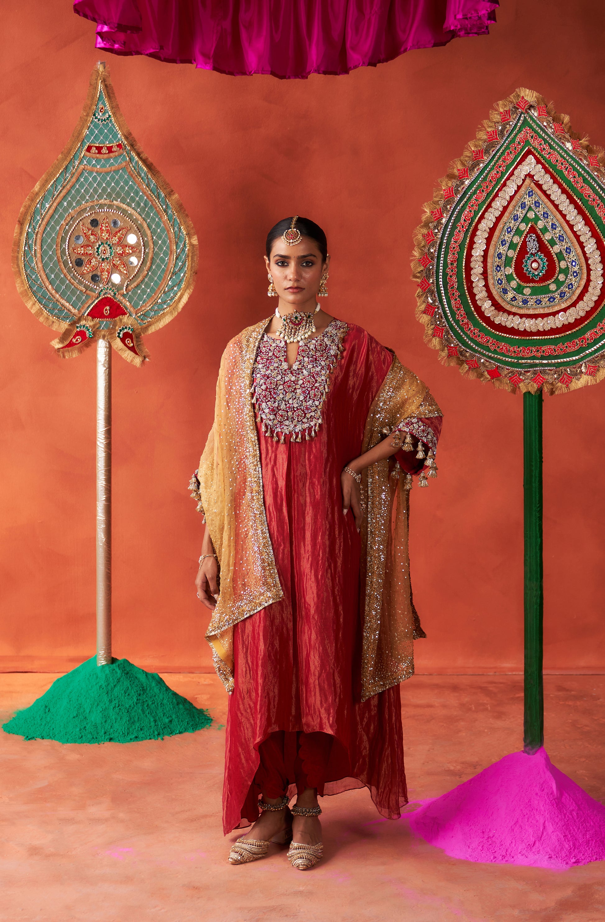 - Color: Red Kurta , Red Pants, Gold Dupatta