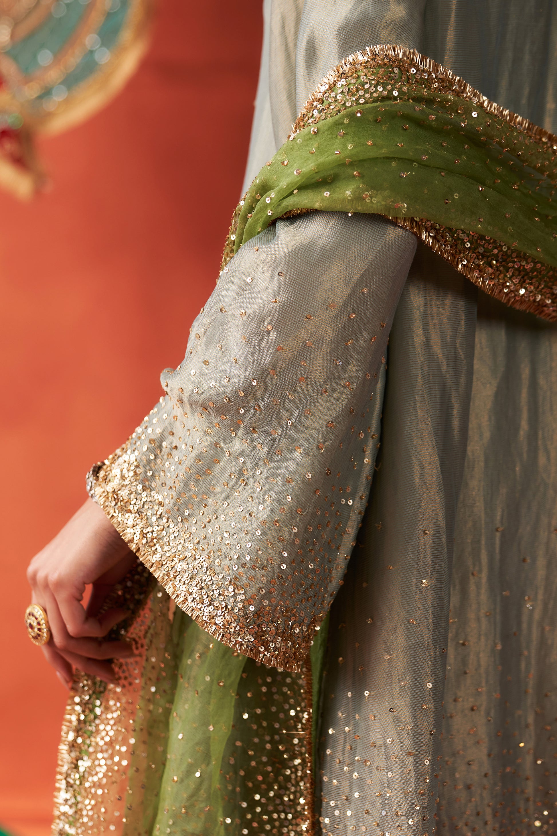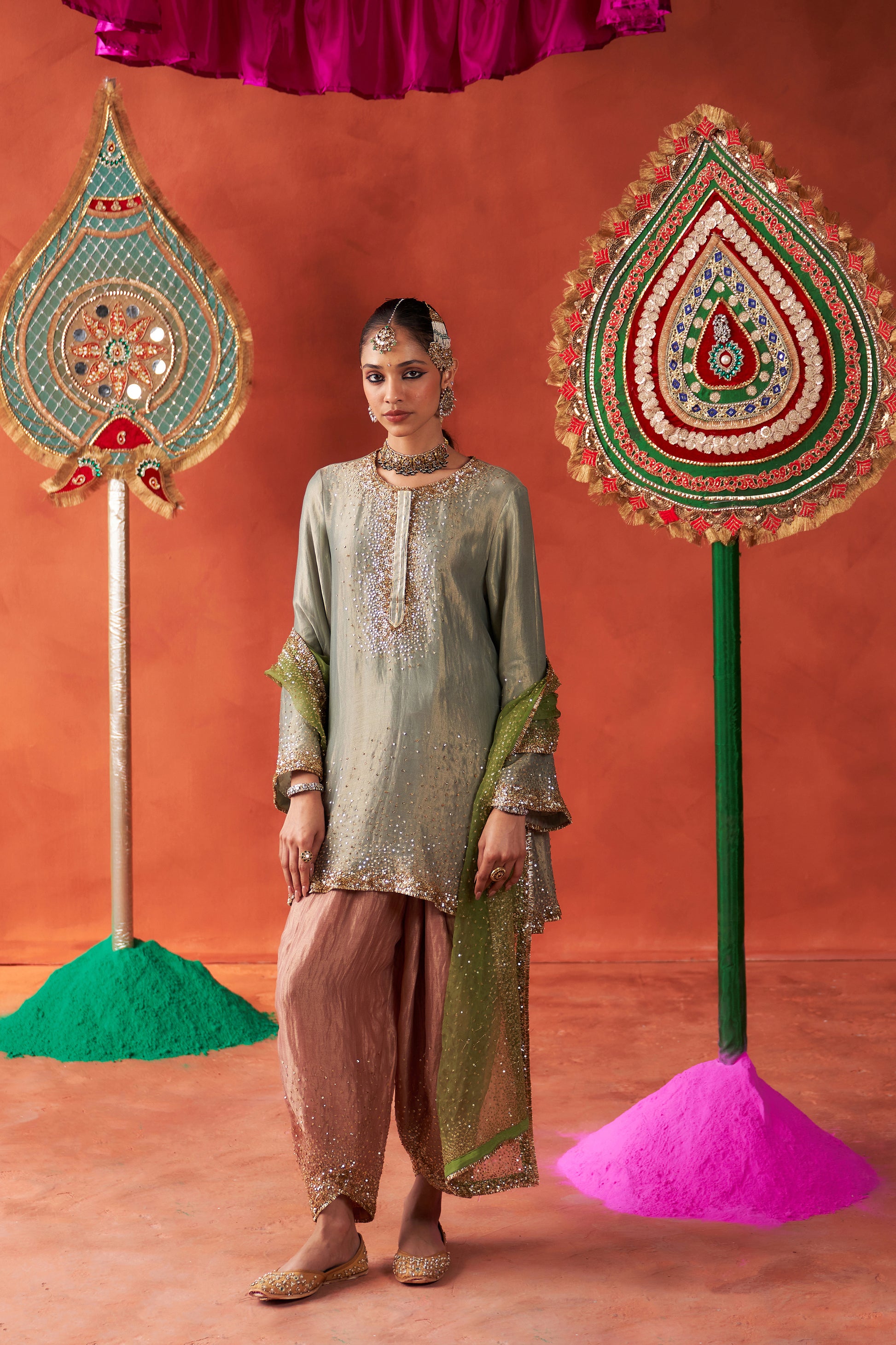 - Color: Powder Blue Kurta, Peach Pink Pants, Mint Dupatta