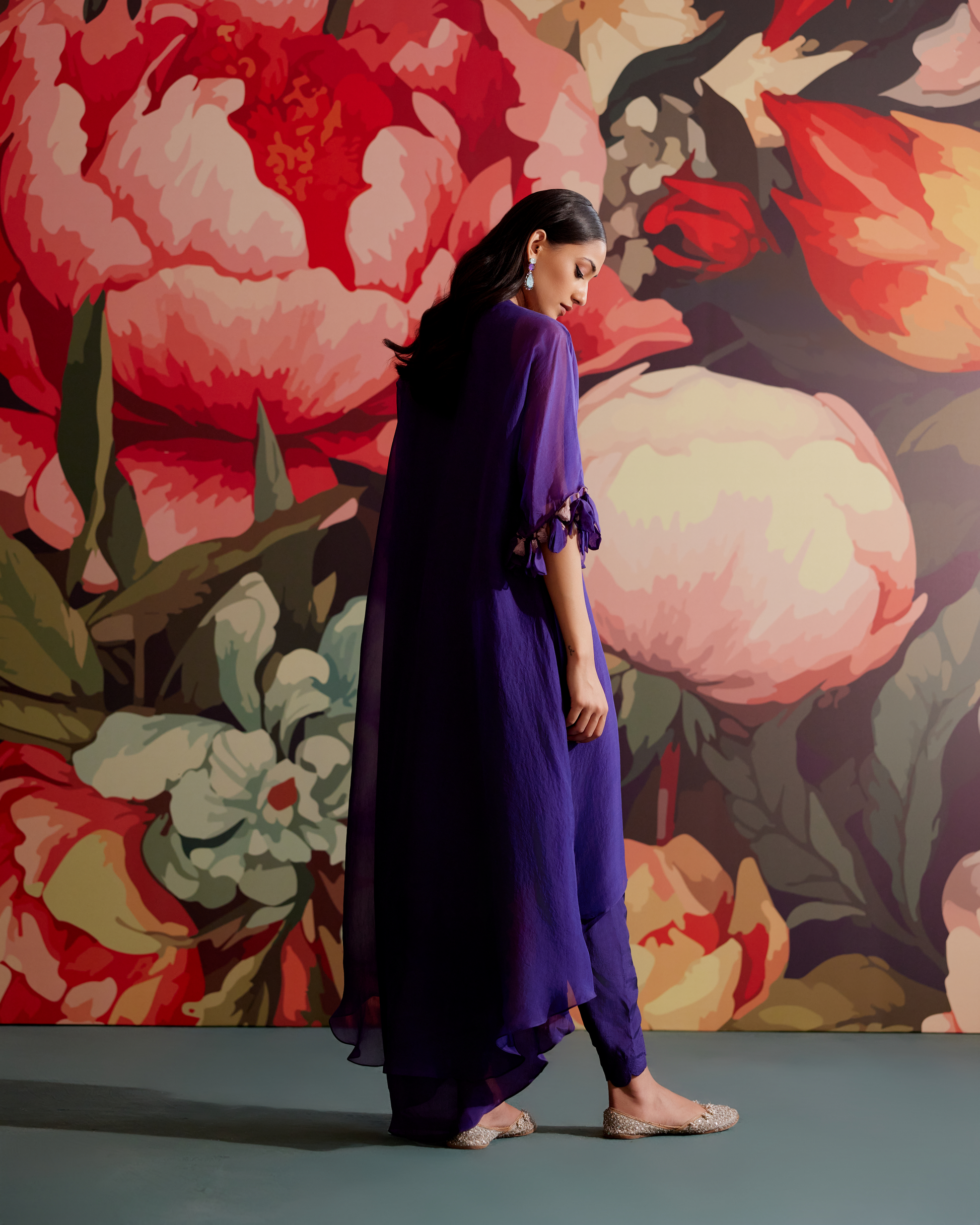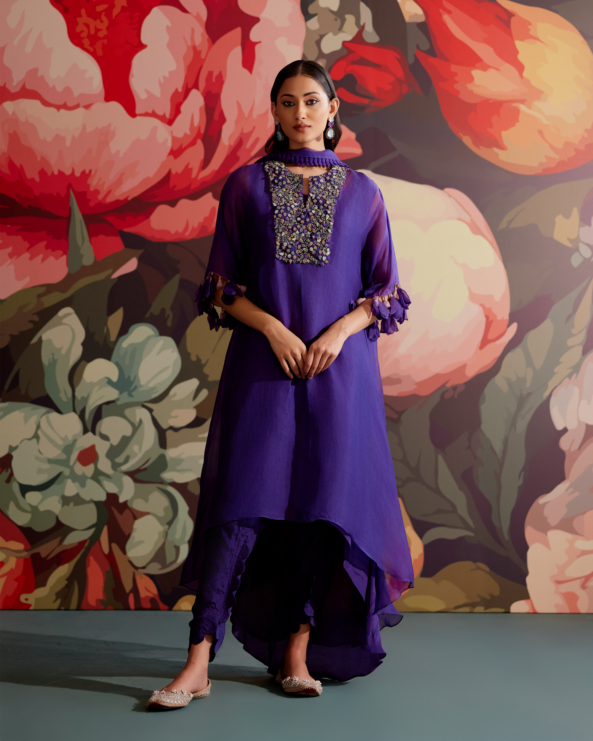 The Mavi Kurta Set is a stunning blend of elegance and craftsmanship. Featuring a rich purple kaftan crafted from pure silk organza, paired with luxurious pure silk crepe tulip pants, slip, and a matching dupatta, this ensemble exudes sophistication. The intricate floral artwork, brought to life with Dori and Zardozi embroidery, adds a touch of opulence, making this set perfect for weddings, festive occasions, or special celebrations.