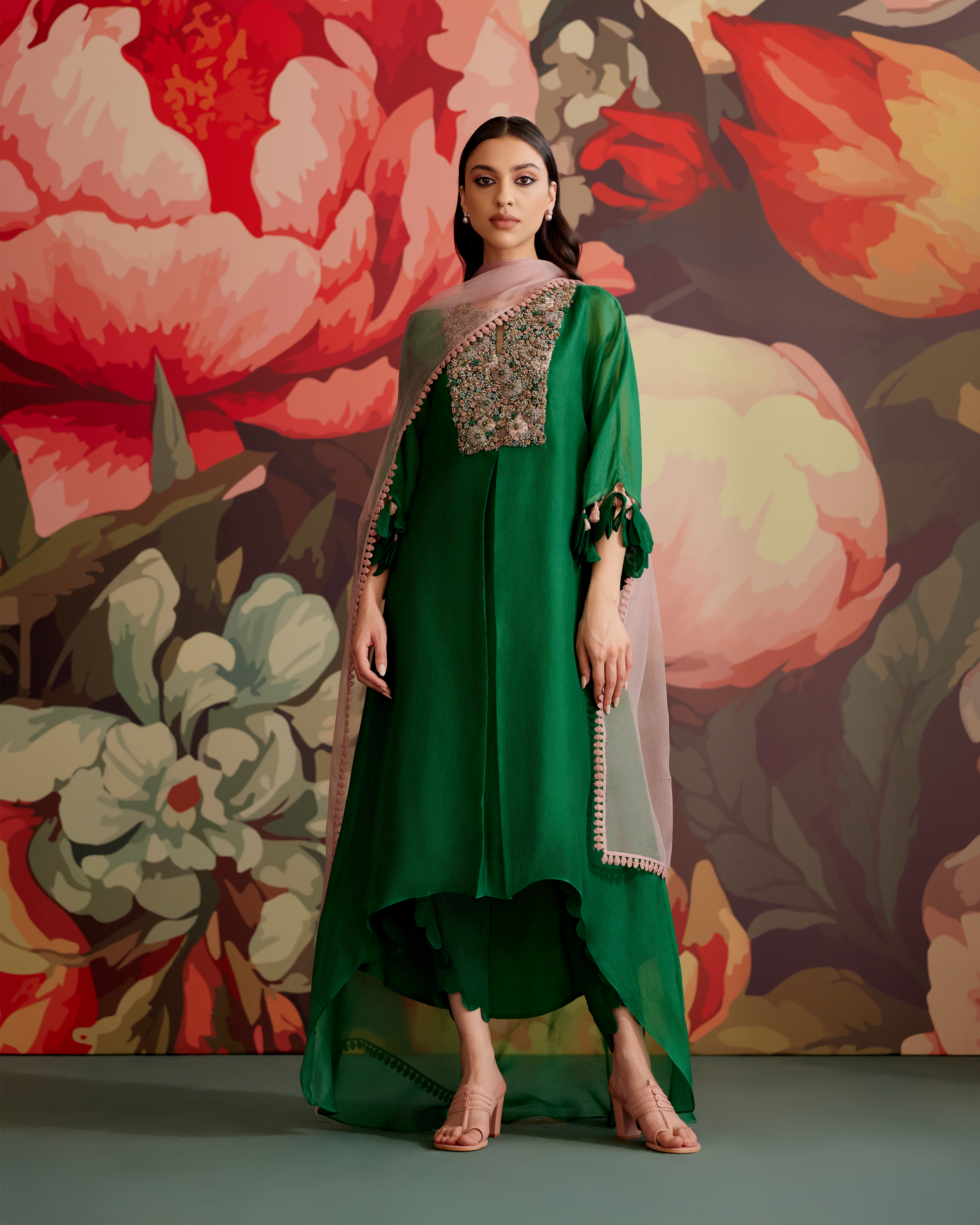The Panna Kurta set in green features intricate floral Dori and Zardosi embroidery, offering a luxurious and modern appeal. The Kaftan, crafted in pure silk Organza, is paired with pure silk Crepe Tulip Pants and a matching Slip for a smooth, flattering fit. The pure silk Organza Dupatta completes the ensemble, blending traditional craftsmanship with contemporary style. Perfect for festive occasions, the Panna Kurta set is a sophisticated choice for those seeking elegance.
