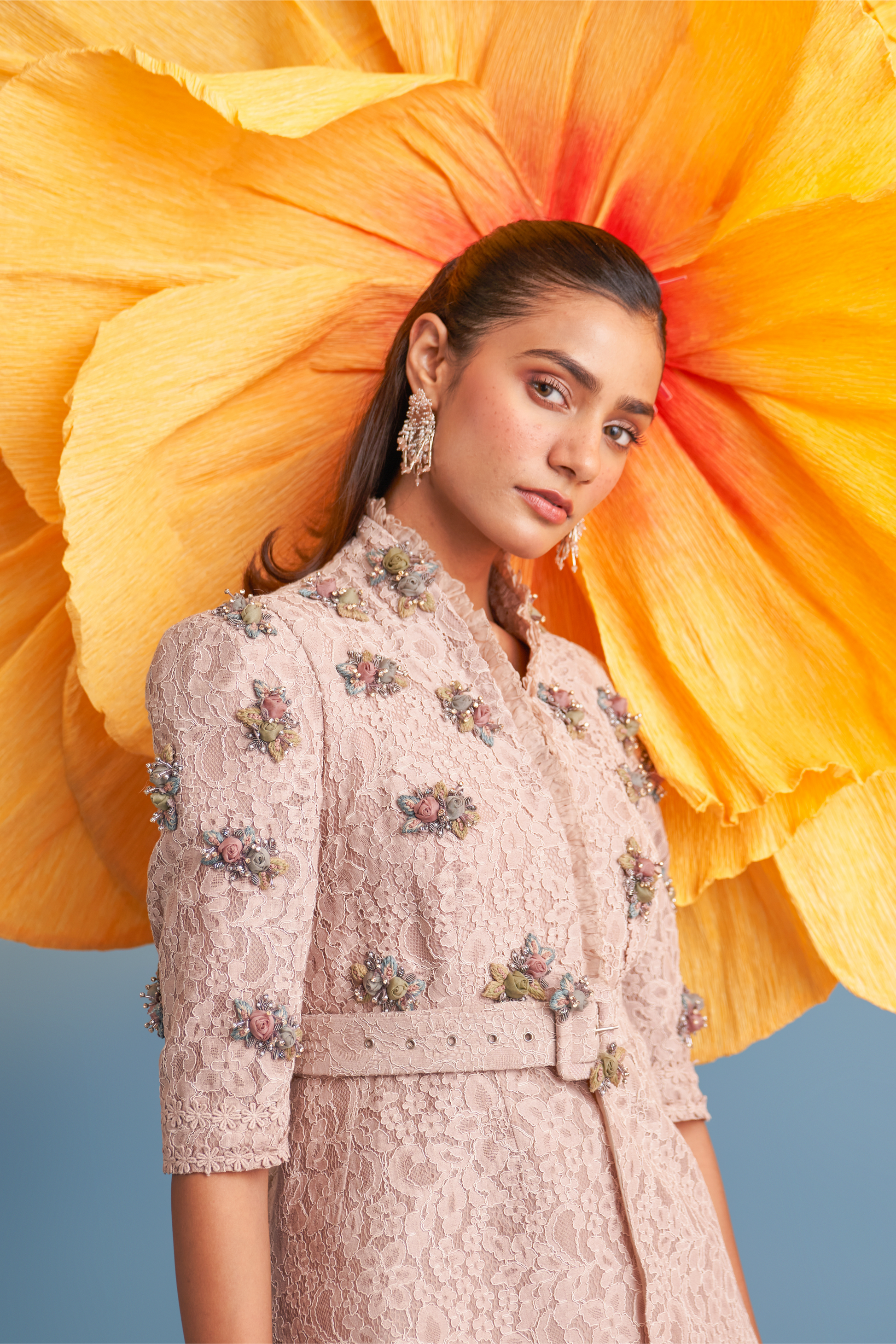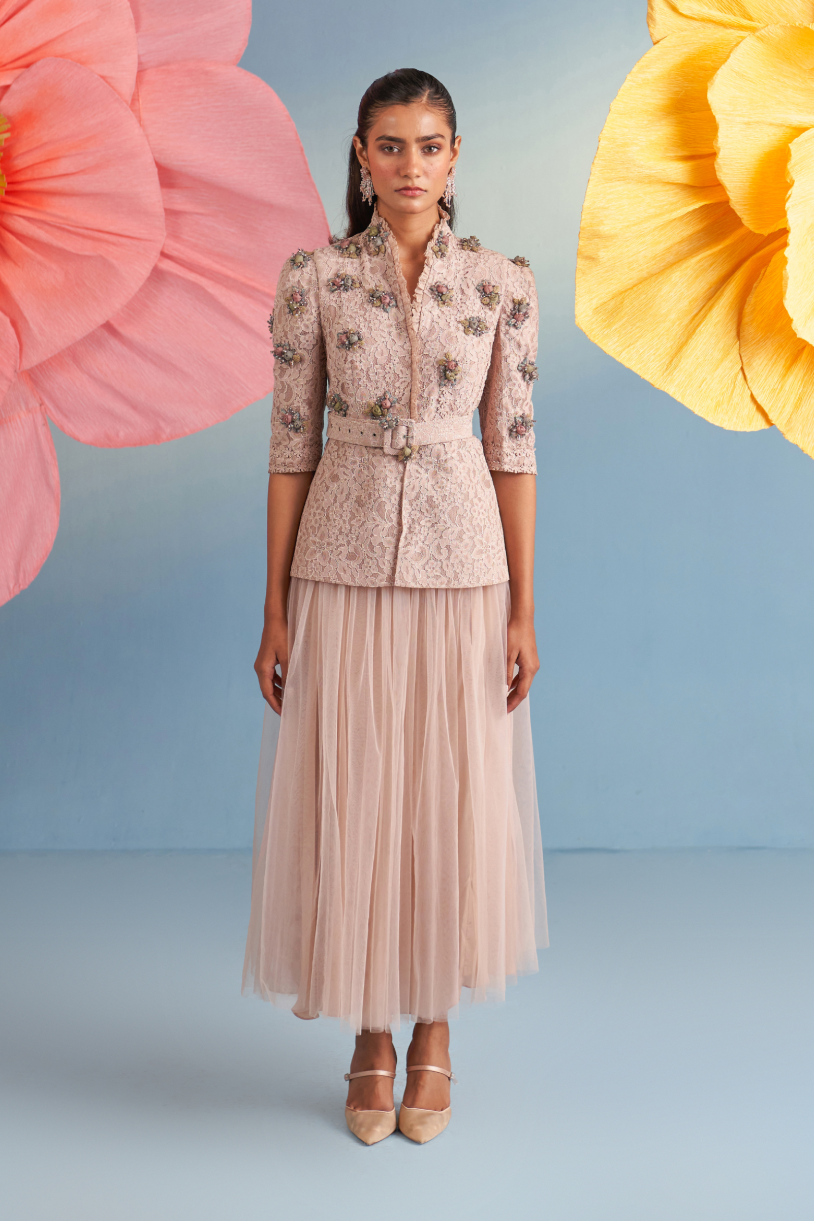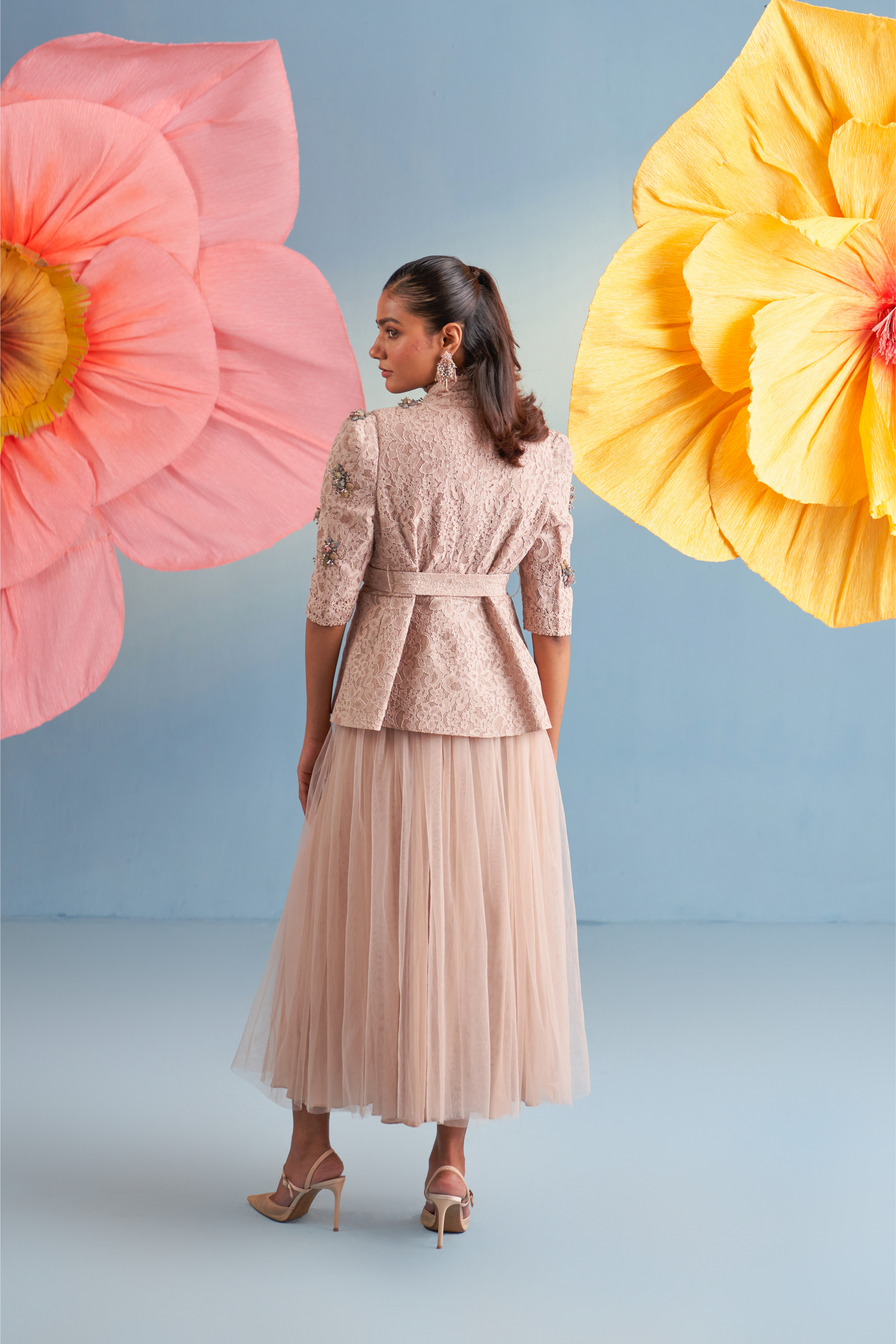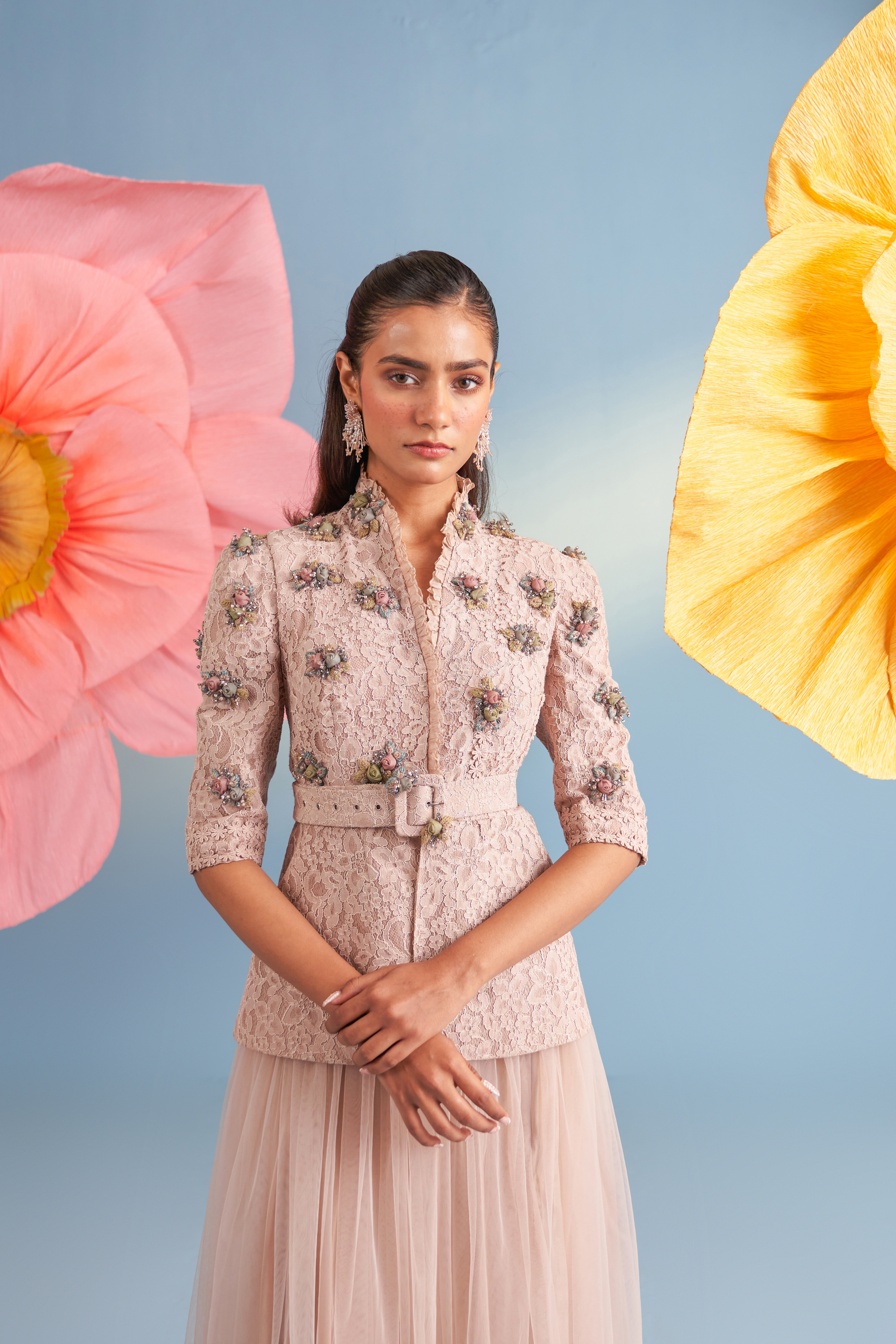 Graceful and refined, the Serena Set in nude pink is a soft yet striking three-piece ensemble. Comprising a lace and net jacket, a gently flared skirt, and a structured belt, the piece is adorned with intricate 3D rose appliquŽ. This romantic coordination captures the essence of the English era and Parisian elegance Ñ perfect for evening wear and formal occasions.